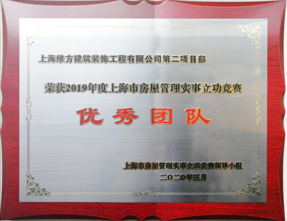 上海維方建筑裝飾工程有限公司第二項(xiàng)目部獲評(píng)2019年度上海市房屋管理事實(shí)立功競(jìng)賽城市更新分賽區(qū)優(yōu)秀團(tuán)隊(duì)稱(chēng)號(hào),公司總經(jīng)理獲評(píng)記功個(gè)人。